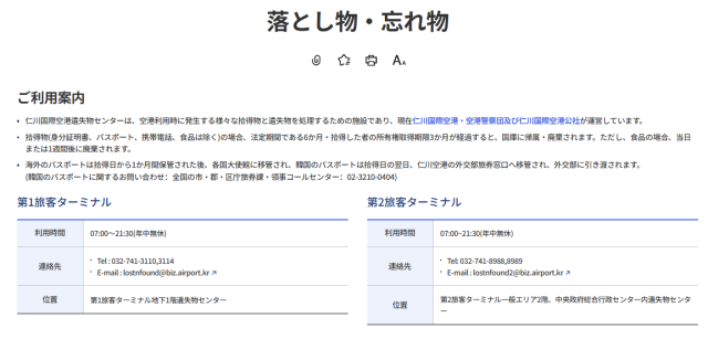 仁川空港の公式サイトには「落とし物・忘れ物カウンター」のEメールアドレスが記載されています。