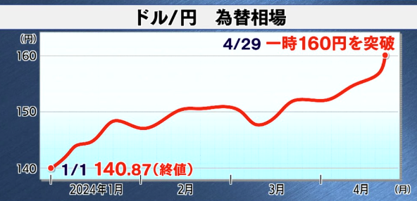 2024年6月、ドル円為替レートは1ドル=160円台まで値下がりしました。