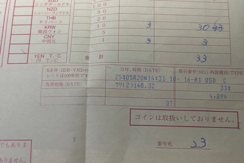 換金所レートはこのときUSD=148.32円で、1ドル紙幣以下の換金に対応していないのがその理由です。