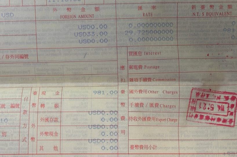 台湾でUSD33=NTD981だったので、台湾の銀行レートはNTD=USD29.727でした。