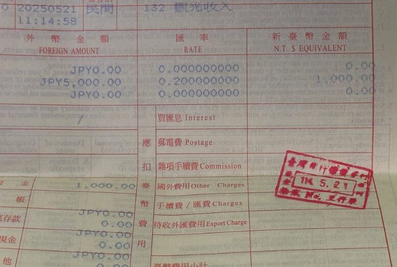 日本円を台湾で台湾ドルに換金すると、5,000円あたりNTD1,000の受け取りとなりました。