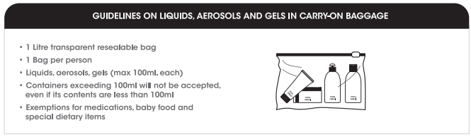 - 液体、エアゾール、ジェルはそれぞれ100mlの容量制限