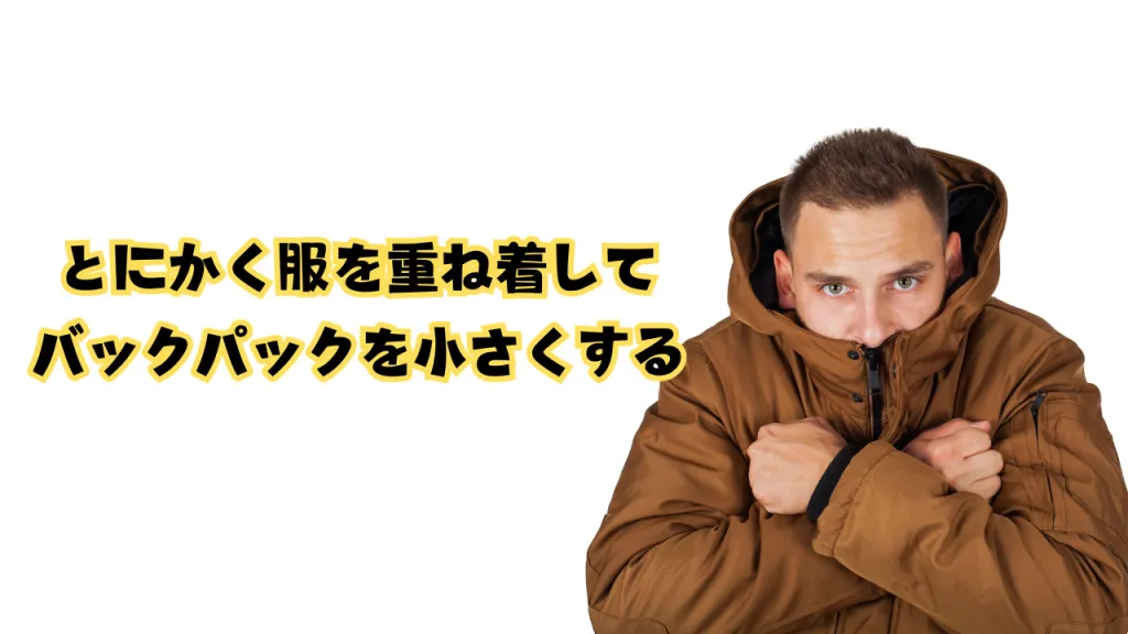Tシャツやパーカーをジャケットの中に着てバックパックのサイズを小さくします。