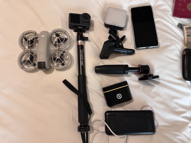 私は撮影機材としてドローン、アクションカメラ、2台のスマホを使っています。