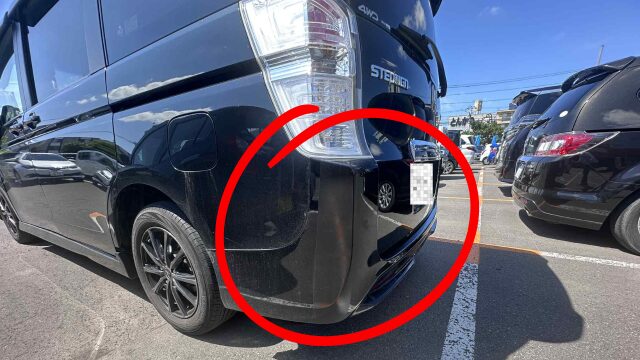 車の後ろ左側の色がかわっている部分がキズついた箇所です。