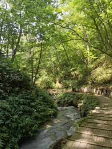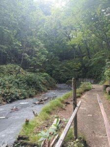 大湯沼川天然足湯は、登別温泉街から徒歩で20〜30分ほど。道中は森林に囲まれ、小川のせせらぎや鳥の声を聞きながら進みます。