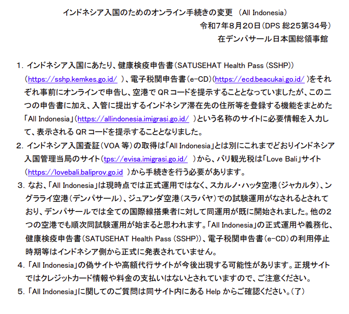 2025年8月18日より、インドネシアでは新しい入国手続きシステム 「All Indonesia」 が試験的に導入されています。