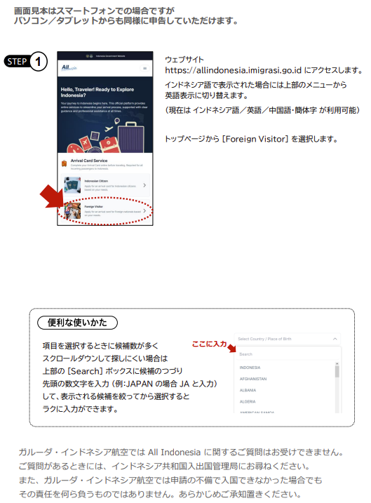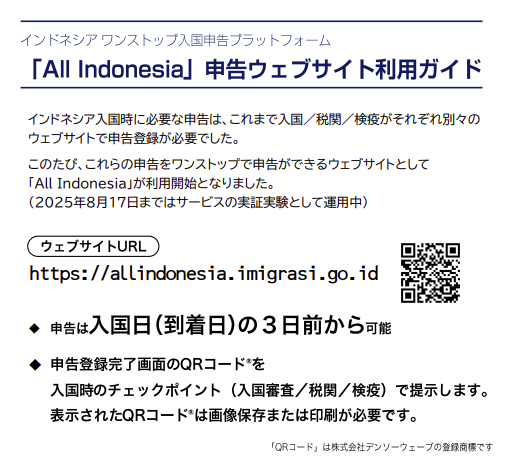 「All Indonesia」は、従来の入国手続きを一元化したオンライン登録システムです。