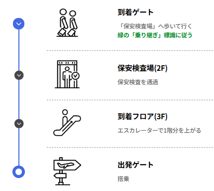 | ✔️ 仁川での動き | 「Transfer」表示に沿って移動、保安検査を受けてゲートへ |