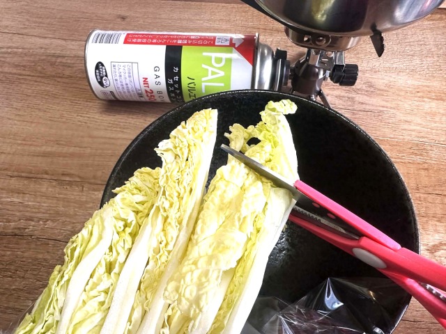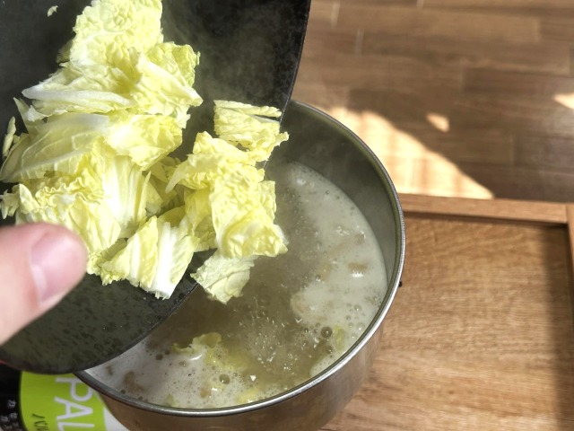 カットした白菜を鍋に入れてスープと一緒に少し煮ます。