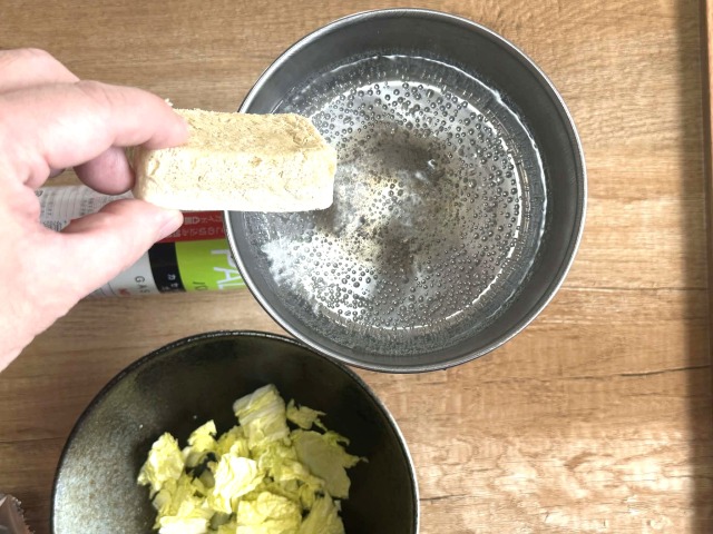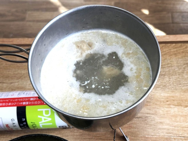 沸騰したお湯に銀色の袋の中のフリーズドライスープを入れます。