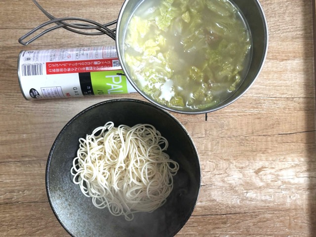 2分間茹でた麺をスープに合わせて完成です。