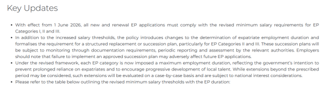 2026年6月1日以降に申請・更新されるEmployment Passは、以下の新基準が適用されます。